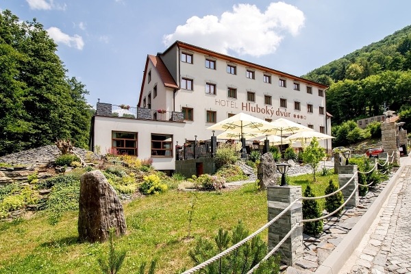Hotelová část resortu — Wellness hotel Hluboký dvůr — nabízí moderní pokoje a apartmány, a apartmánové chaty či mobilhomy pro rodiny nebo větší skupiny.